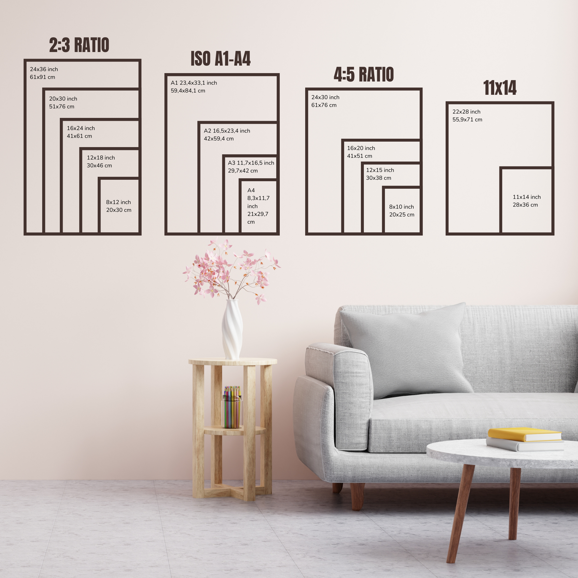 cm: 10x15, 20x30, 30x45, 40x60, 50x76, 61x91